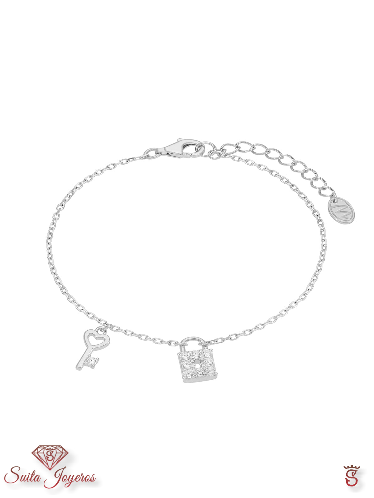 Pulsera llave y candado. Plata de 1ª Ley rodiada. Circonitas en microengaste. Cierre mosquetón. Cadena adaptable.