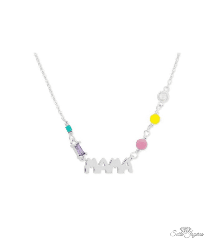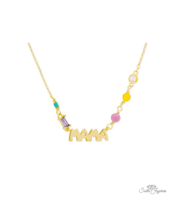 Colgante Mamá Piedras Colores Plata.Collar love mamá. Plata de 1ª Ley baño en oro de 18k. Circonitas en microengaste. Circonita talla corazón. Cierre mosquetón. Cadena adaptable.