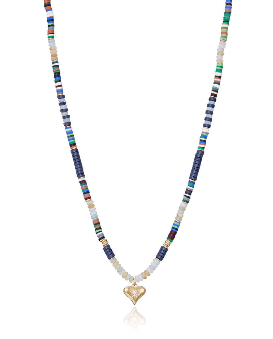 COLLAR KISS DE ACERO CON PIEDRAS DE COLORES Y COLGANTE CORAZÓN EN IP DORADO