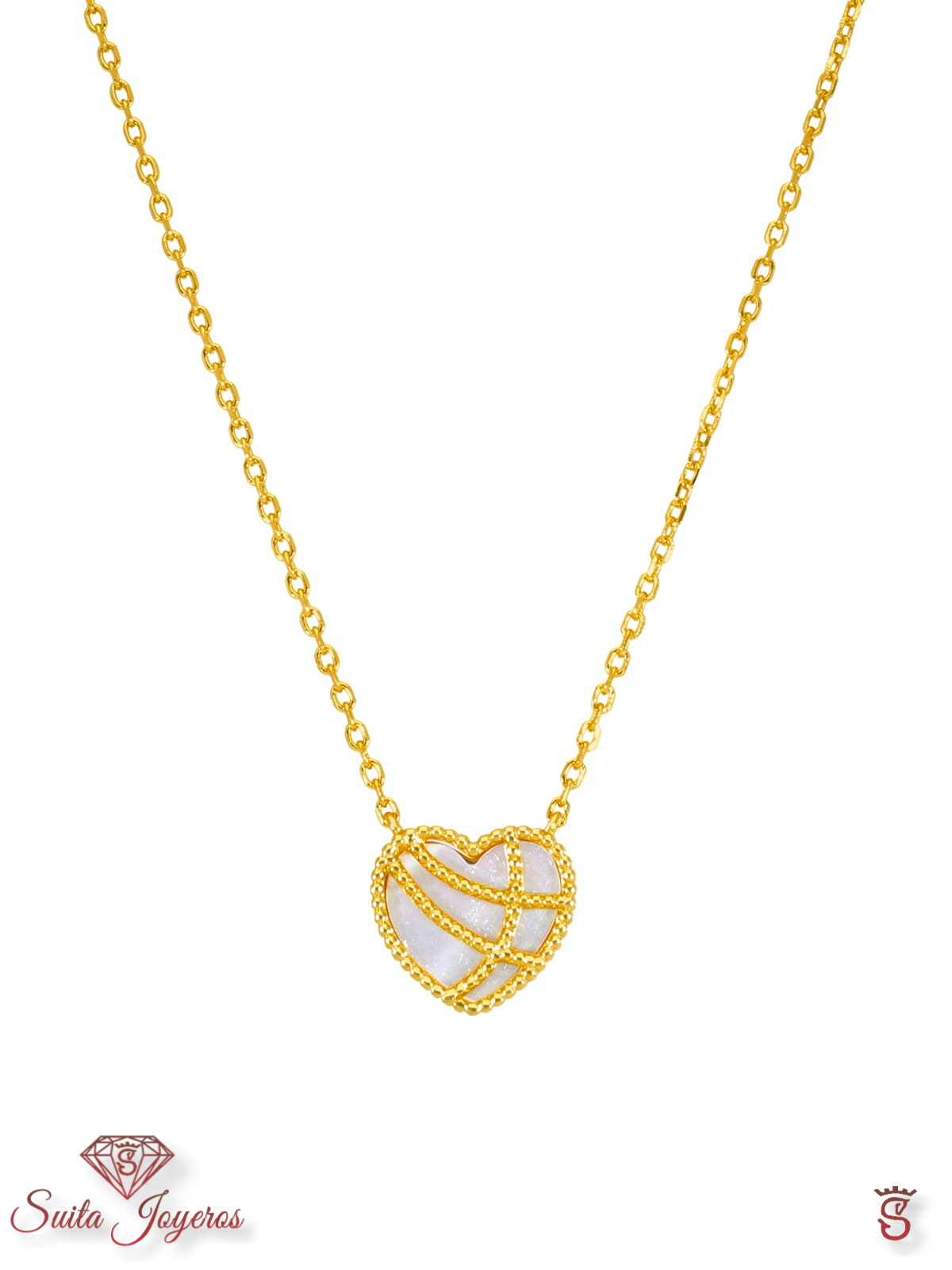 Collar corazón nácar. Plata de 1ª Ley baño en oro de 18k. Nácar natural. Cierre mosquetón. Cadena adaptable.