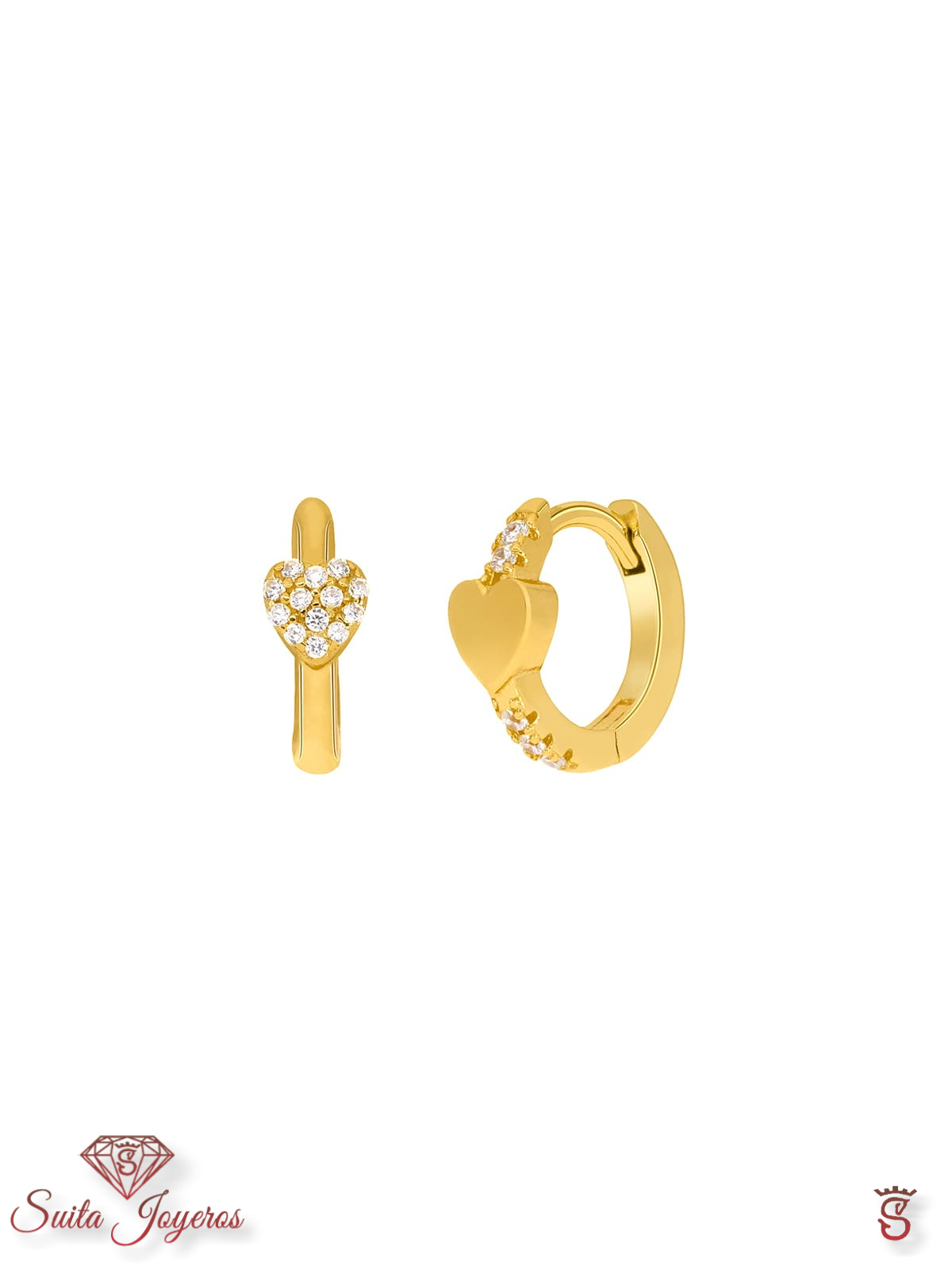 Pendientes corazones combinación brillo y circonitas. Plata de 1ª Ley baño en oro de 18k. Circonitas en microengaste. Cierre huggy.