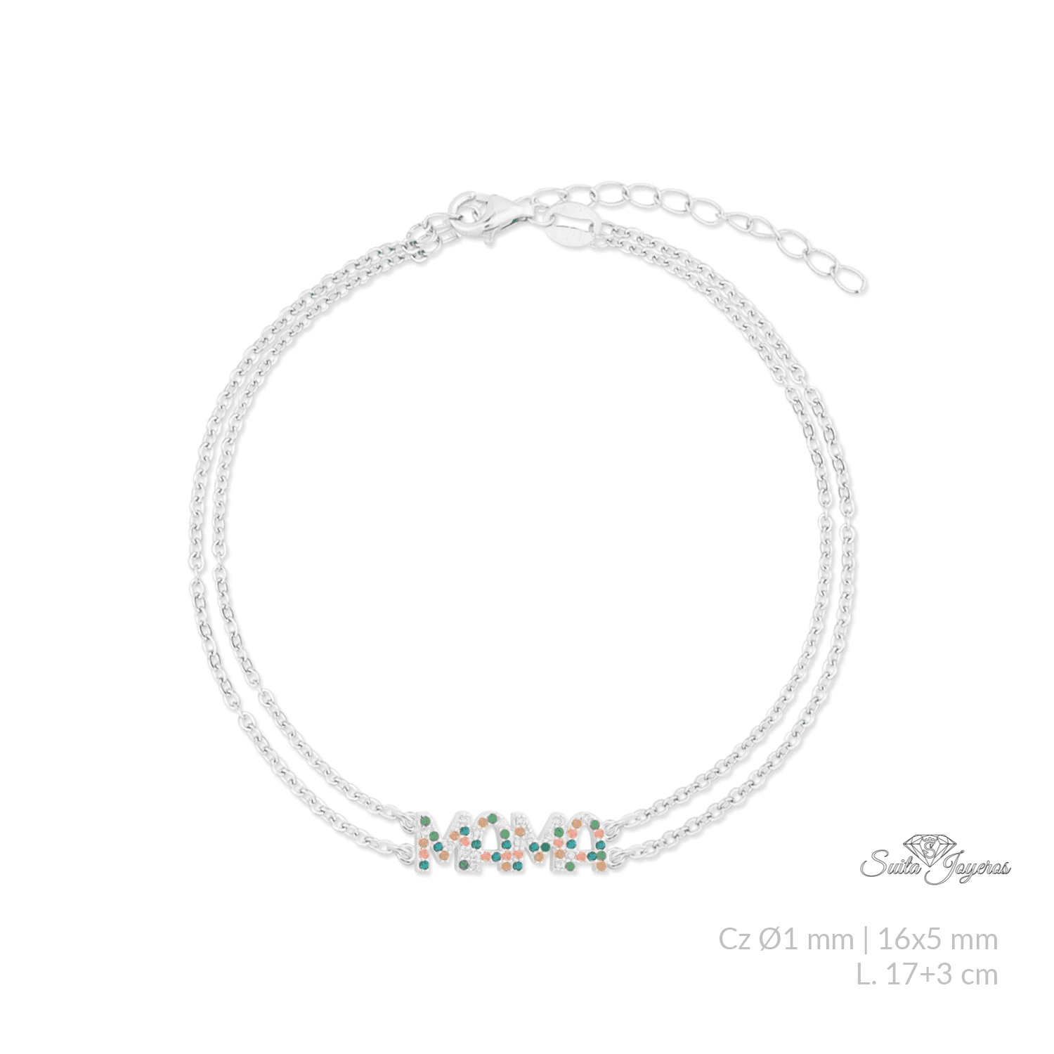 Pulsera Mamá Circonitas Multicolor. Pulsera love mamá. Plata de 1ª Ley baño en oro de 18k. Circonitas en microengaste. Circonita talla corazón. Cierre mosquetón. Cadena adaptable.