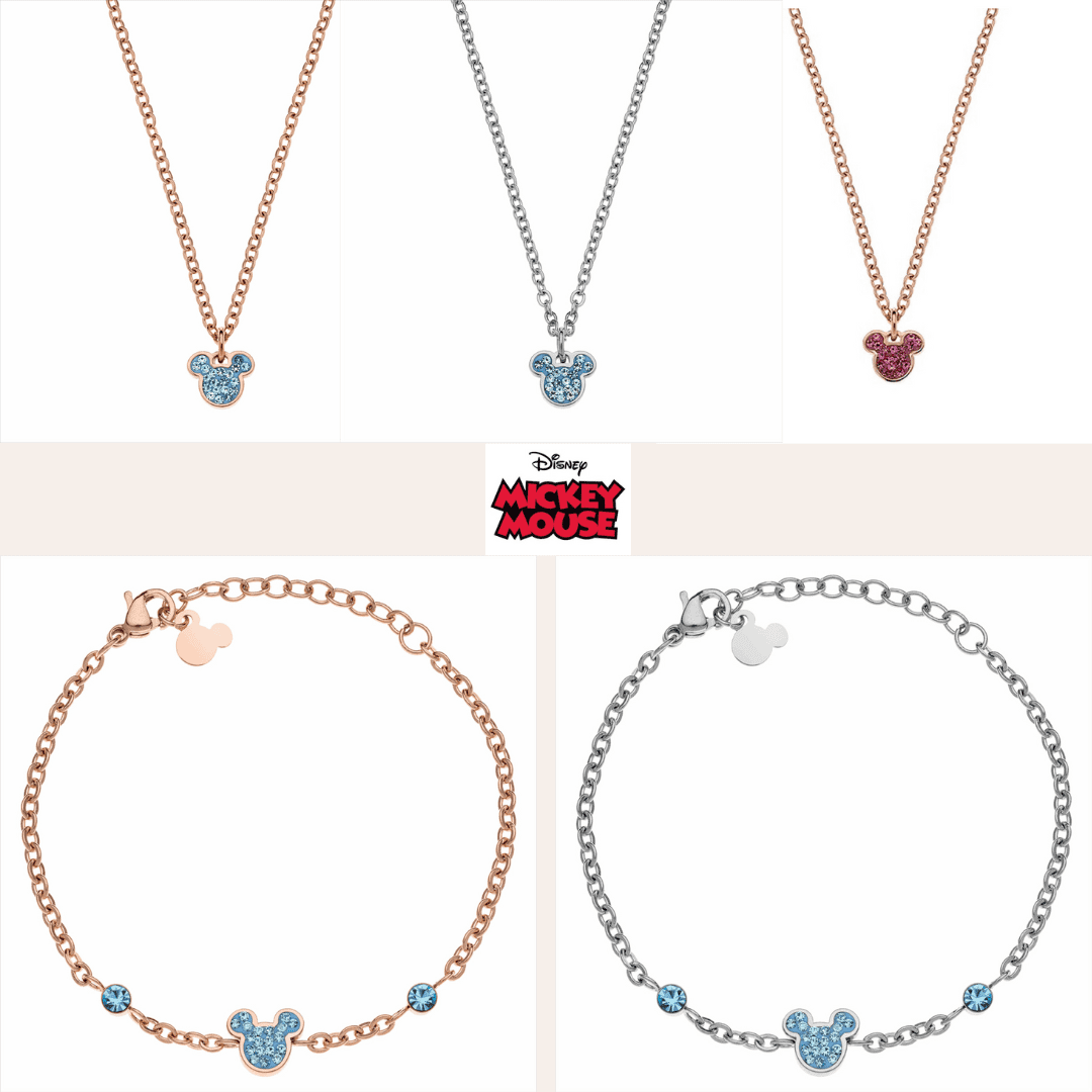Pulsera y colgante Disney Mickey circonitas en acero para Niña. Colección de pulseras y colgantes fabricada en acero de primera calidad y chapada en oro amarillo y rosa. Son unos pendientes originales de la marca disney.